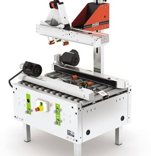 É uma máquina auto dimensionada, que utiliza fita auto adesiva de 30mm a 50mm de largura, fechando simultaneamente o topo e a base das caixas, ajustando-se automaticamente à altura e largura das mesmas.